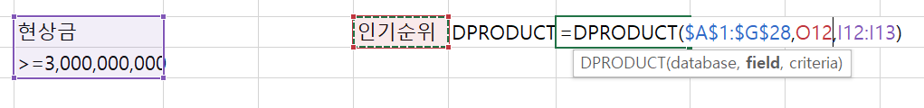 04. DPROUDCT 함수Criteria를 만족하는 레코드들에 한하여, Field로 지정한 열의 모든 값에 대한 곱을 구한다.