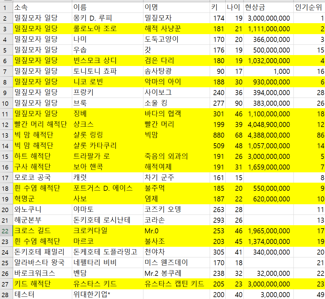 위의 예제는 소속이 밀짚모자 일당인 레코드의 이명을 가져오는 작업을 한다.