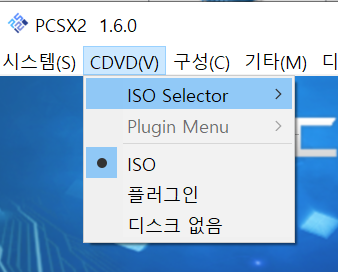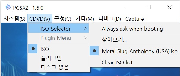 롬은 CDVD 의 ISO Selector 를 이용하여 선택하면 된다. ISO 파일의 롬파일이 준비되어 있어야 한다.
