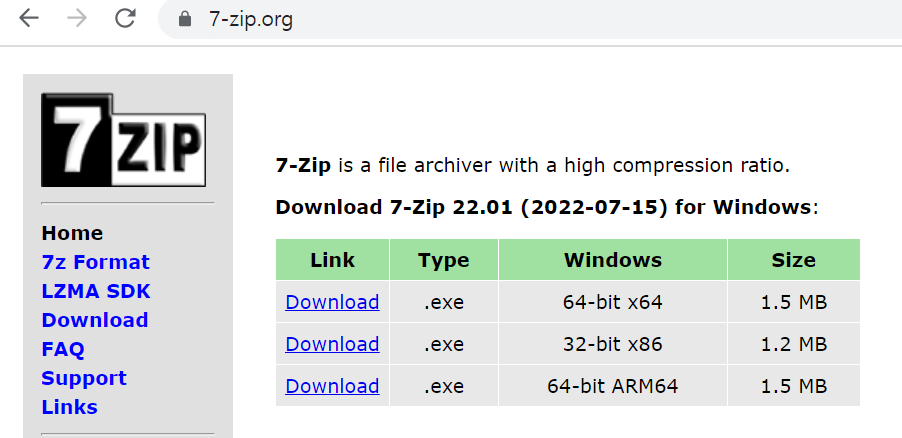7-Zip 7-Zip is a file archiver with a high compression ratio. Download 7-Zip 22.01 (2022-07-15) for Windows: Link Type Windows Size Download .exe 64-bit x64 1.5 MB Download .exe 32-bit x86 1.2 MB Download .exe 64-bit ARM64 1.5 MB License 7-Zip is free soft