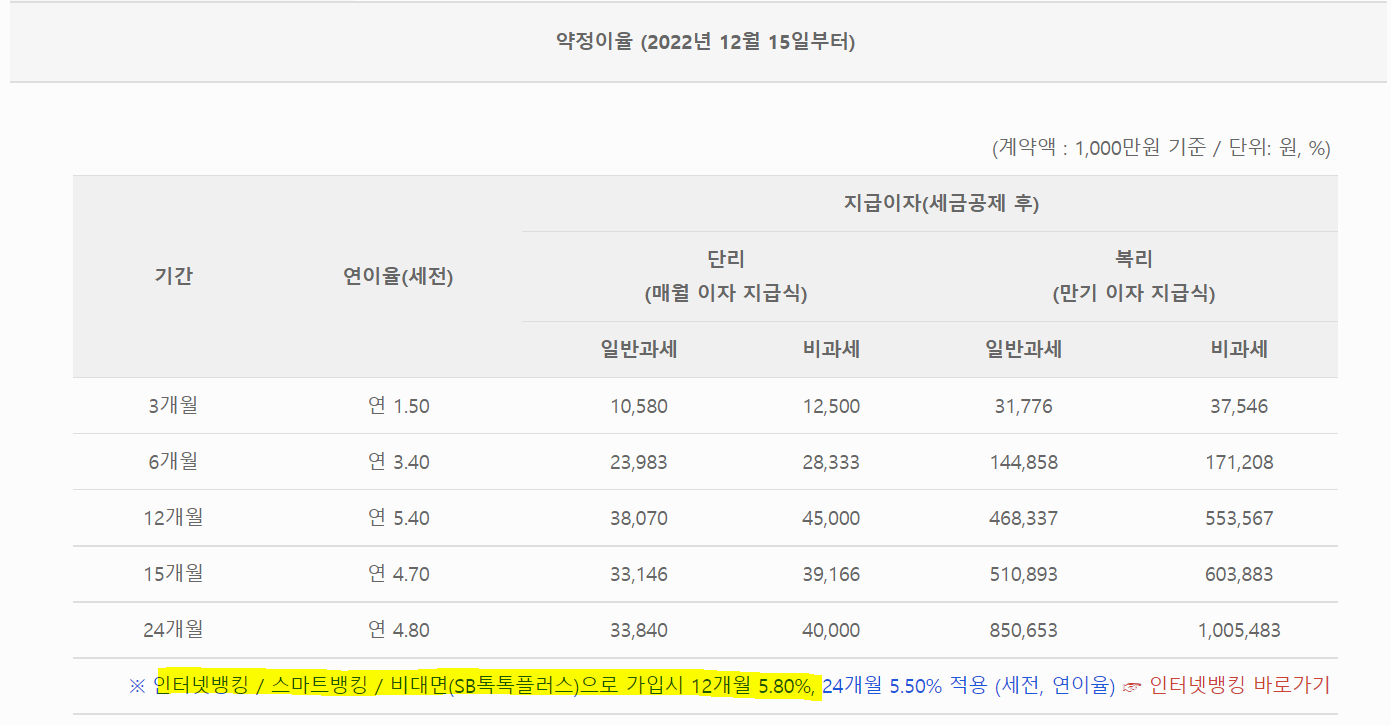 인터넷뱅킹/스마트뱅킹/비대면(SB톡톡플러스)으로 가입 시 12개월 5.8%, 10만원 이상