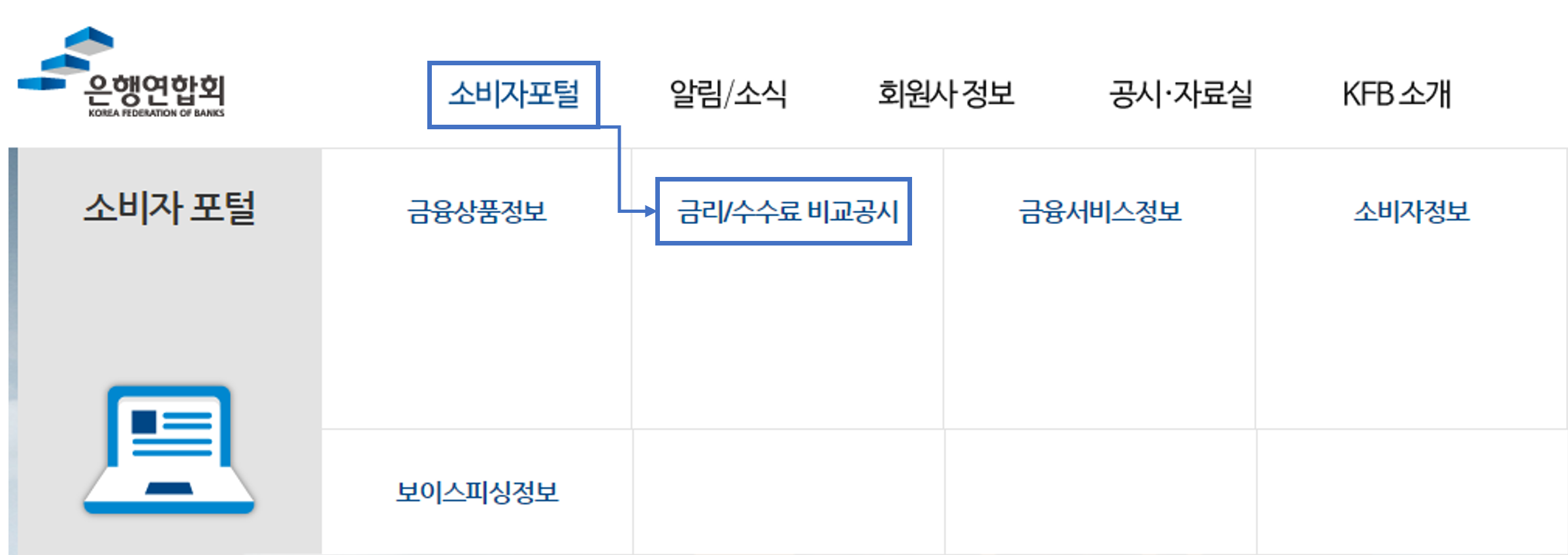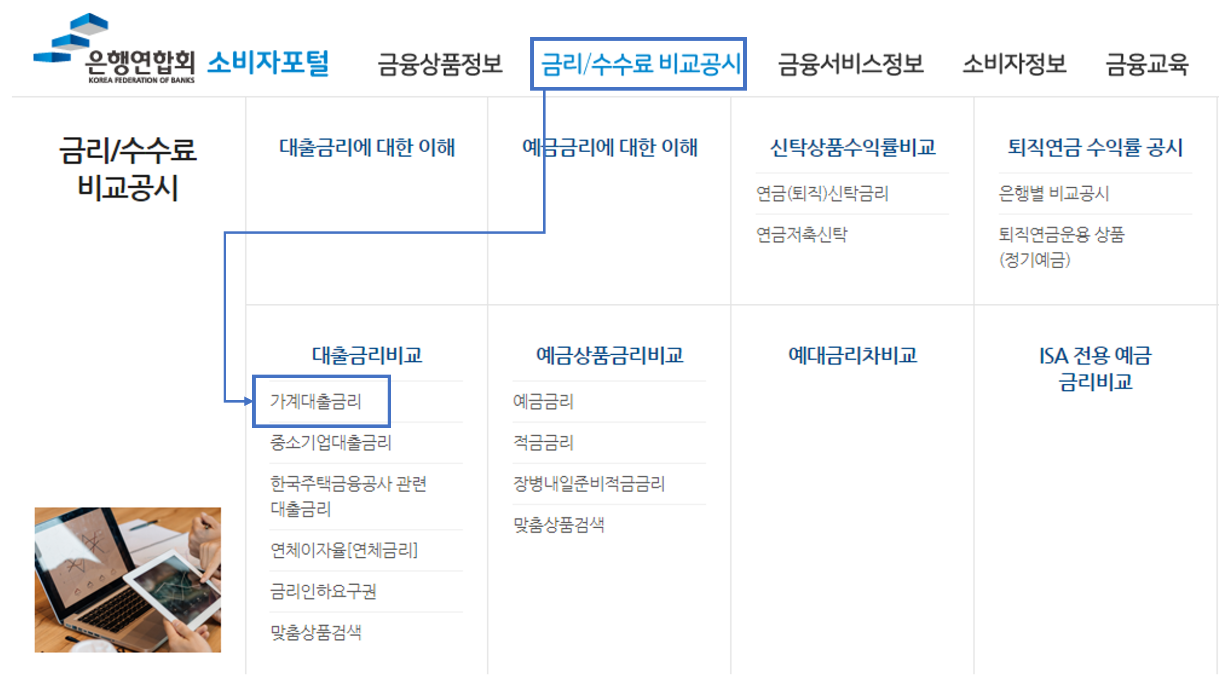 02. 대출 금리 조회주택담보대출 금리를 신용정보조회 없이 알아보기 위해 은행연합회 홈페이지의 소비자 포털 메뉴 안에 있는 "금리/수수료 비교 공시" 메뉴를 클릭한다.