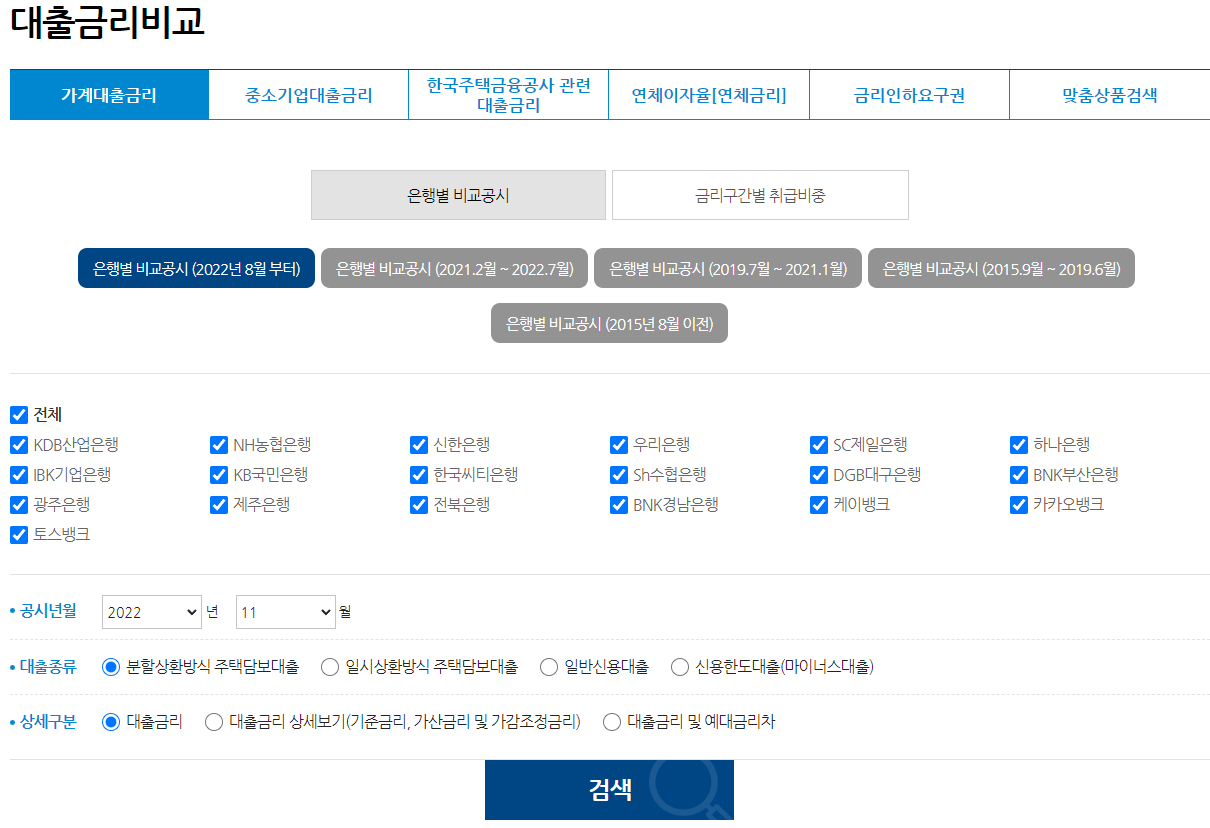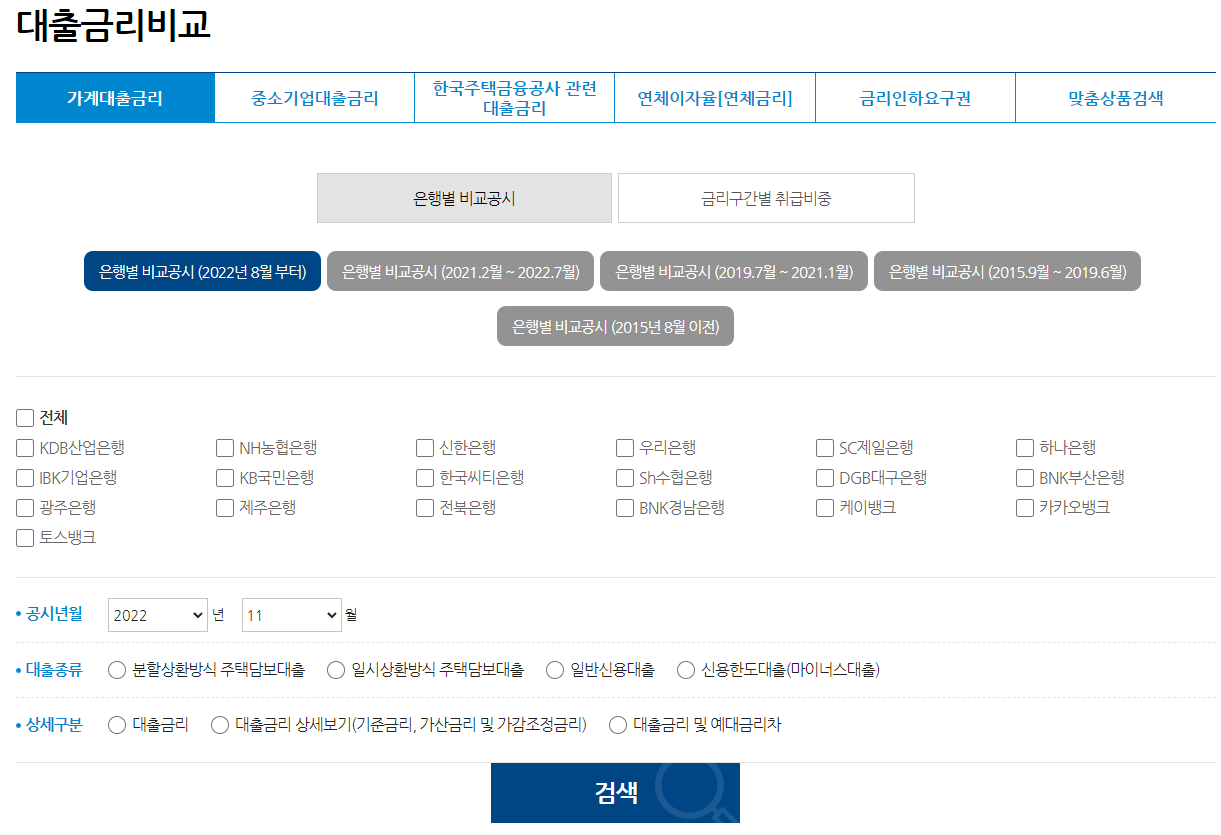 03. 대출 금리 조회 결과주택담보대출 금리를 신용정보조회 없이 알아보기 위해 은행 전체를 클릭 한 후, 공시년월을 선택한다. 대출 종류는 분할상환방식 주택담보대출, 상세 구분에서 대출금리를 선택하면 된다.