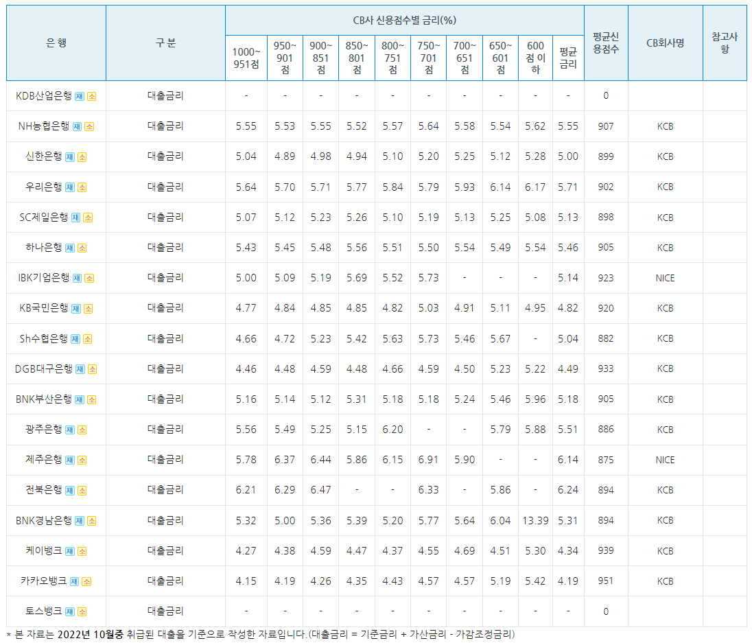 은행별로 NICE, KCB 기준의 신용점수에 기반한 대략적인 대출금리가 정리되어 있다.