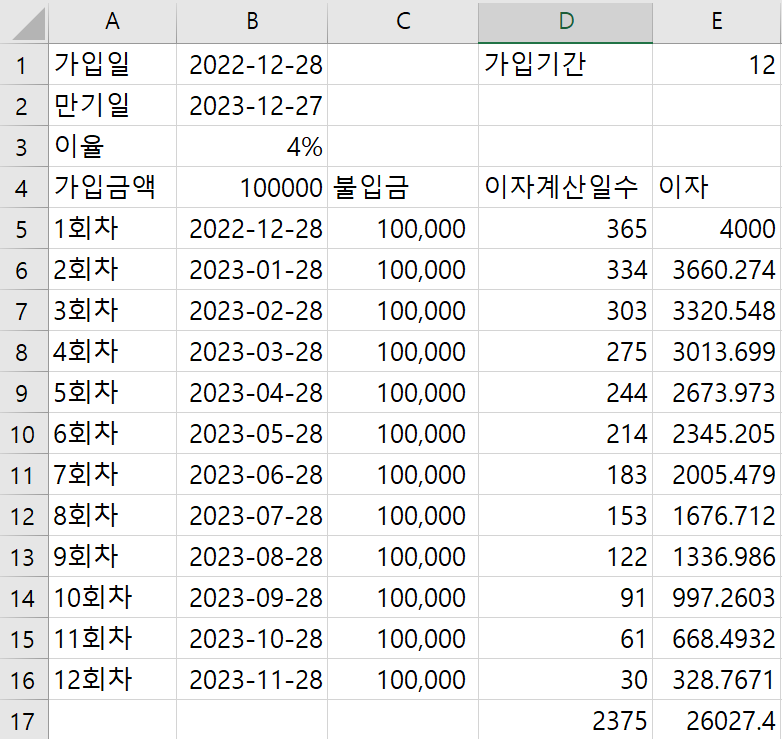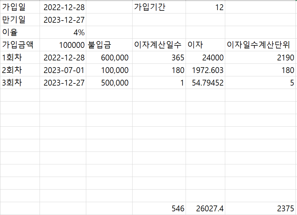 가입일에 따라 다르겠지만 대체로 1회차 금액은 365일에 대한 이자가 붙고, 2회차 금액은 334일에 대한 이자가 붙고....12회차 금액은 30일에 대한 이자가 붙을 것이다. (상술한 기간들은 가입일 + 달의 길이(28,29,30,31)에 따라 달라질 수 있다.)