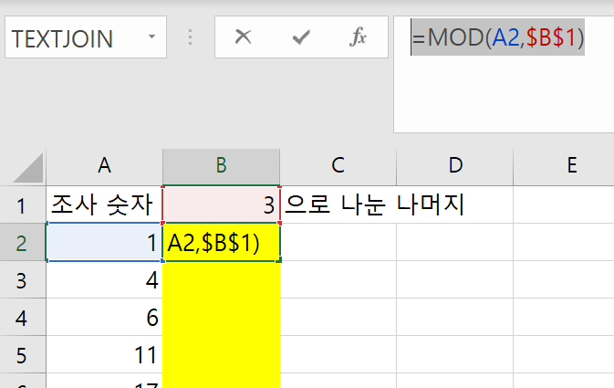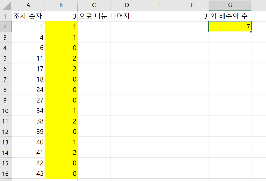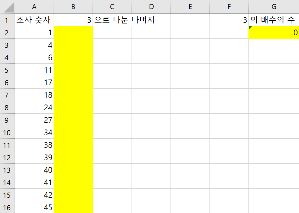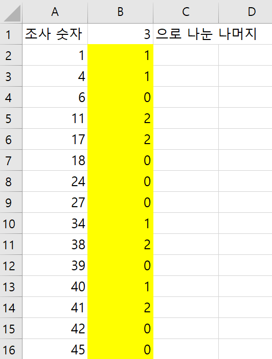 B열에는 3으로 나눈 나머지를 조사할 것이고