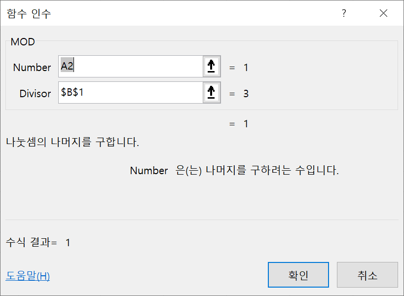 MOD함수는 Number라는 수를 Divisor라는 수로 나눴을 때의 나머지를 반환한다.