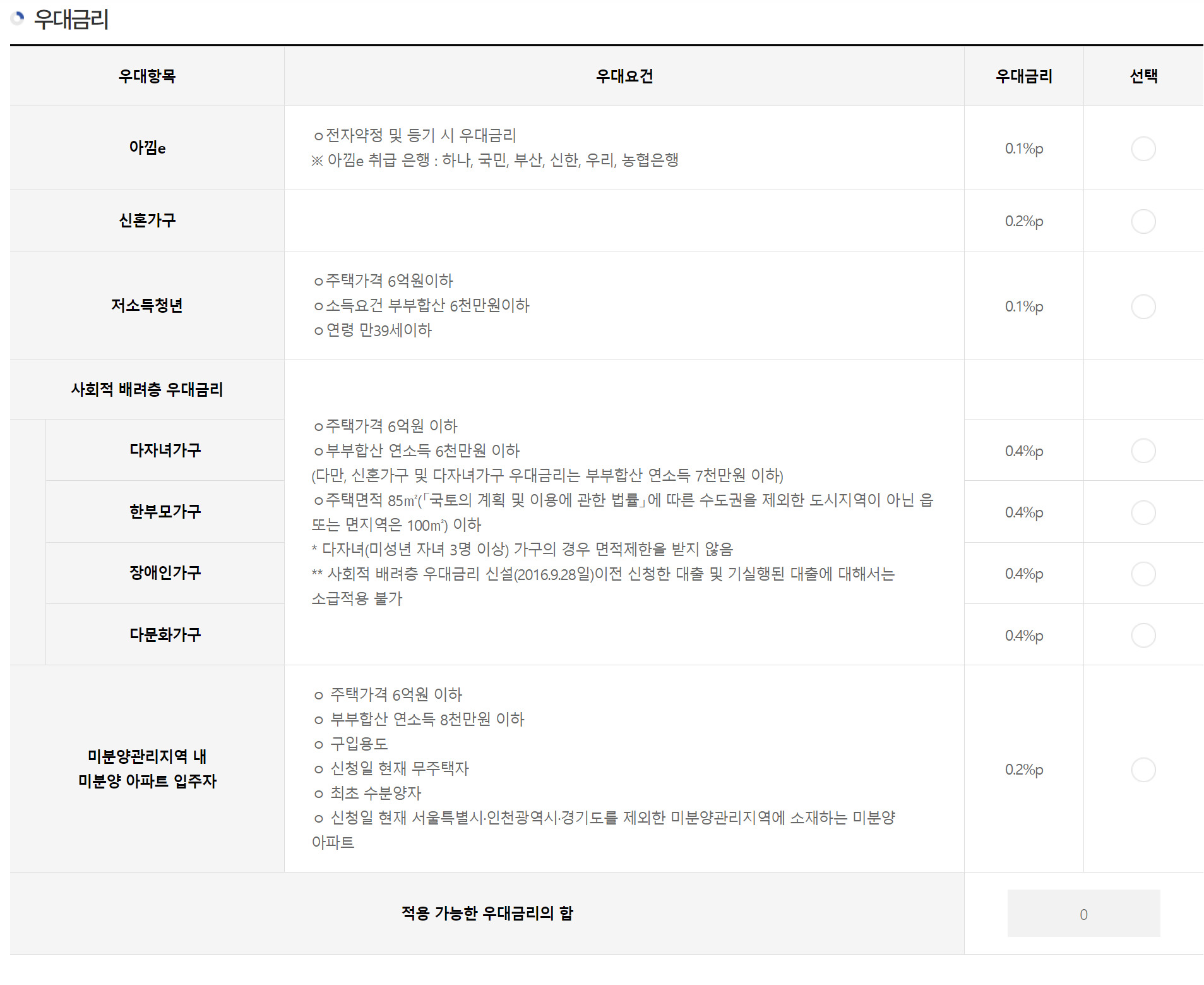 - 우대형: 주택가격 6억원 이하이면서 부부합산 연소득 1억원 이하인 경우 0.1% 우대