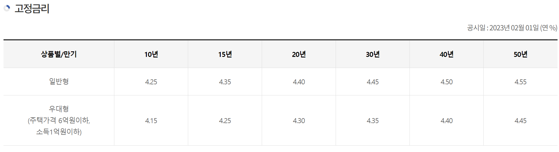 - 일반형: 대출만기별로 공사가 별도 제시하는 대출금리로 고정금리로 적용