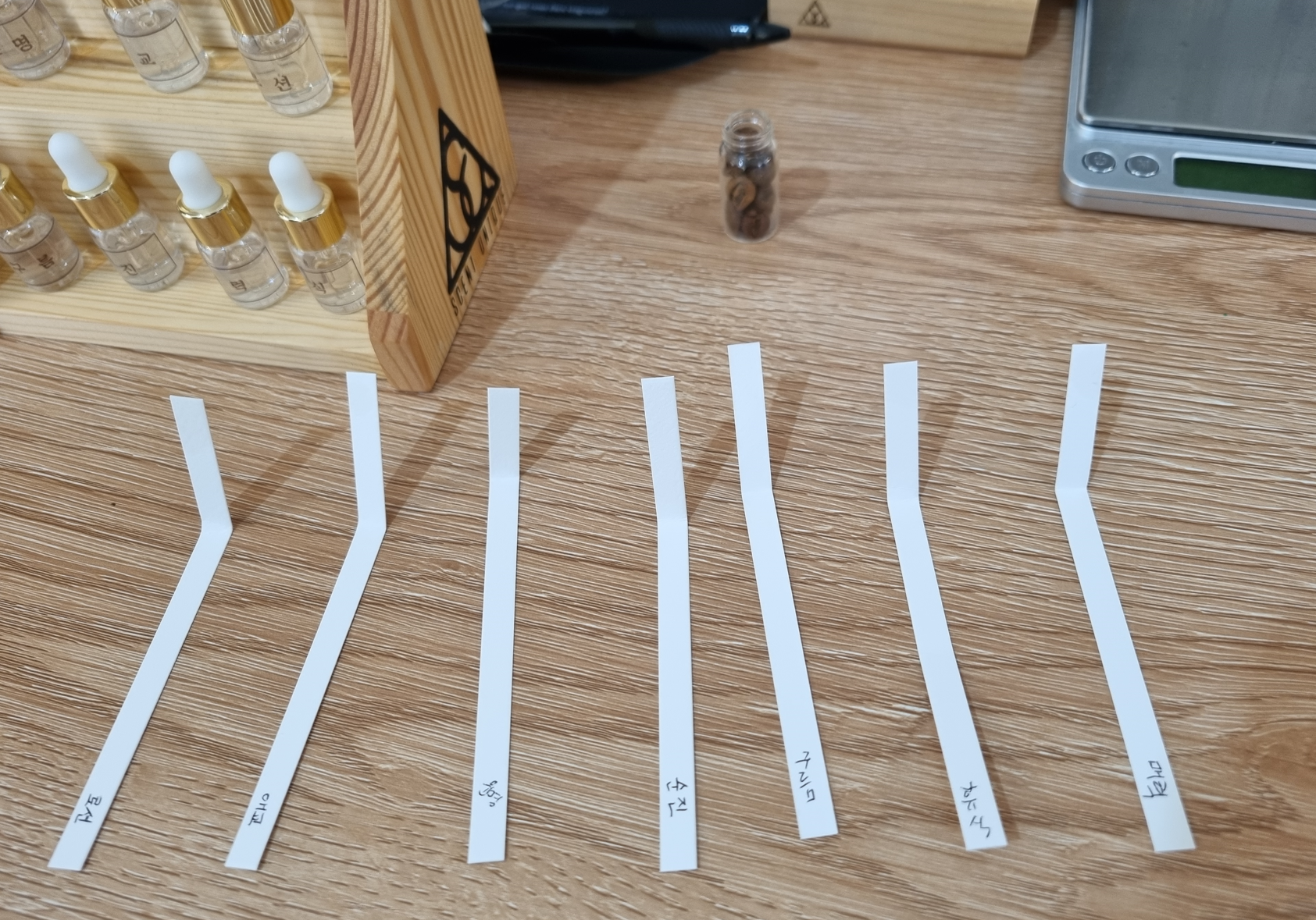 시향지에 각각의 향을 묻히고 자신에게 맞는 향을 선택한다.