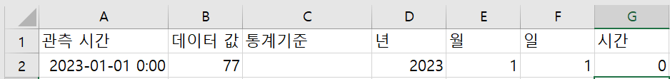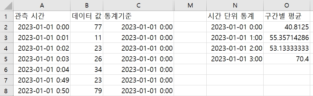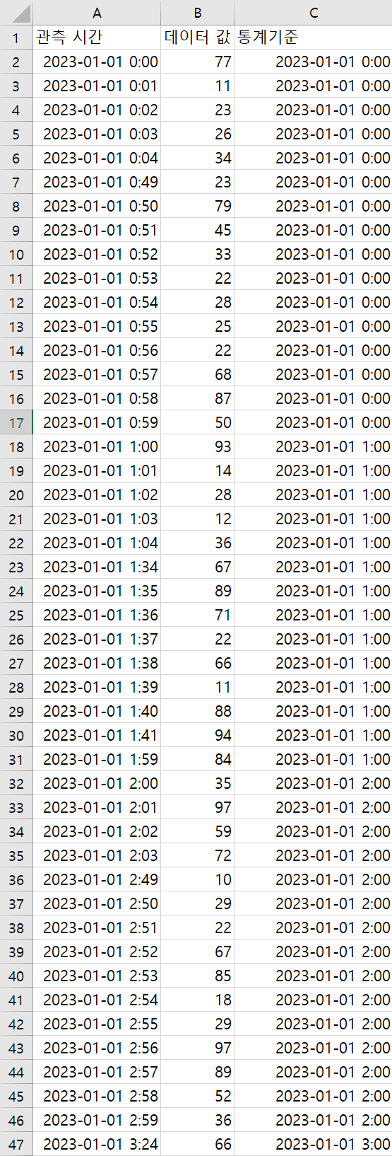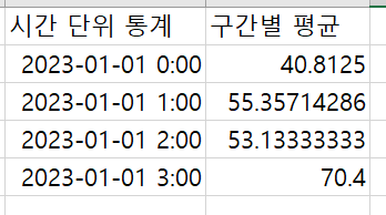 예를들어 2번 사진의 2023-01-01 0:00은 1번 사진의 2023-01-01 0:00 ~ 0:59의 평균값으로 나타내는 겁니다.