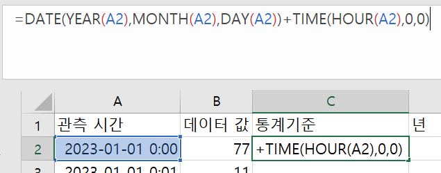관측시간에서 분과 초를 제거한 시간값을 구해서 C에 채워보자