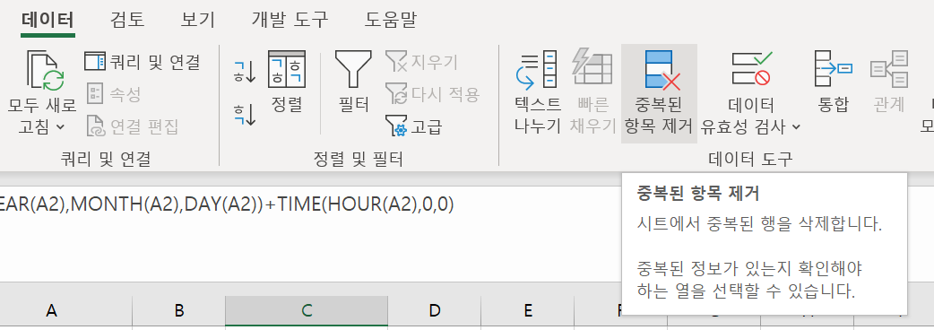 선택 영역 확장하지 않고 그대로 중복 제거하면 다음과 같은 데이터만 남게된다.