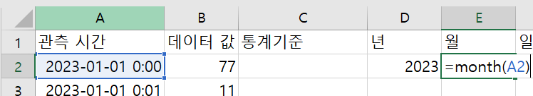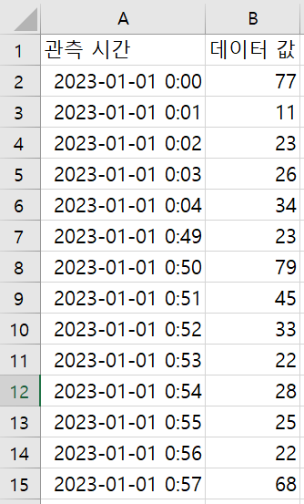 A열과 B열에는 관측 데이터의 관측 시간, B열에는 데이터가 들어가 있다.