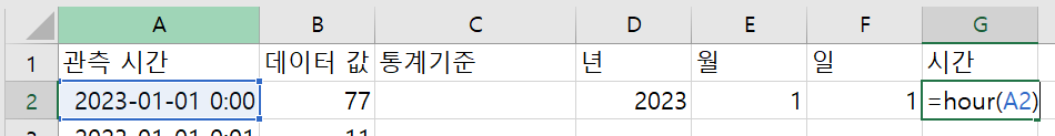엑셀 시간 데이터에서 시,분,초 추출하기