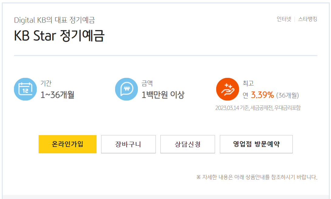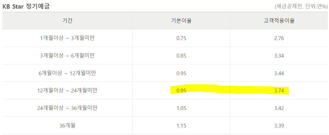 02. 국민은행국민은행의 예금 상품 중 "KB Star 정기예금"의 경우 12개월 이상, 24개월 미만에서 최대 금리 연3.74%(세전)를 적용해준다. 11월에 조사했을 때보다 금리가 내려간 것을 확인하할 수 있다. 약 0.96% 금리가 내려갔다.