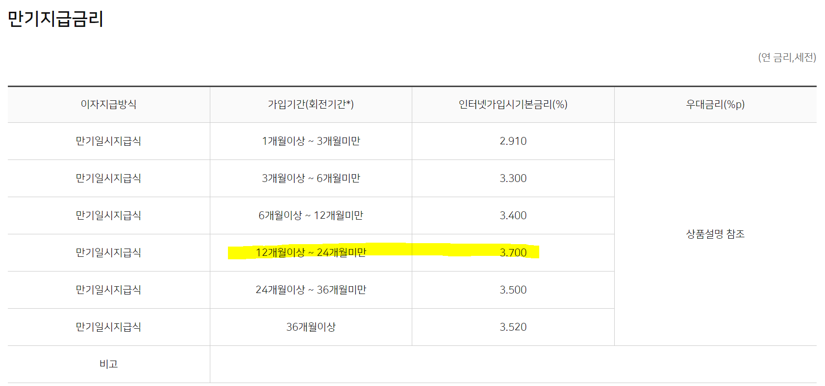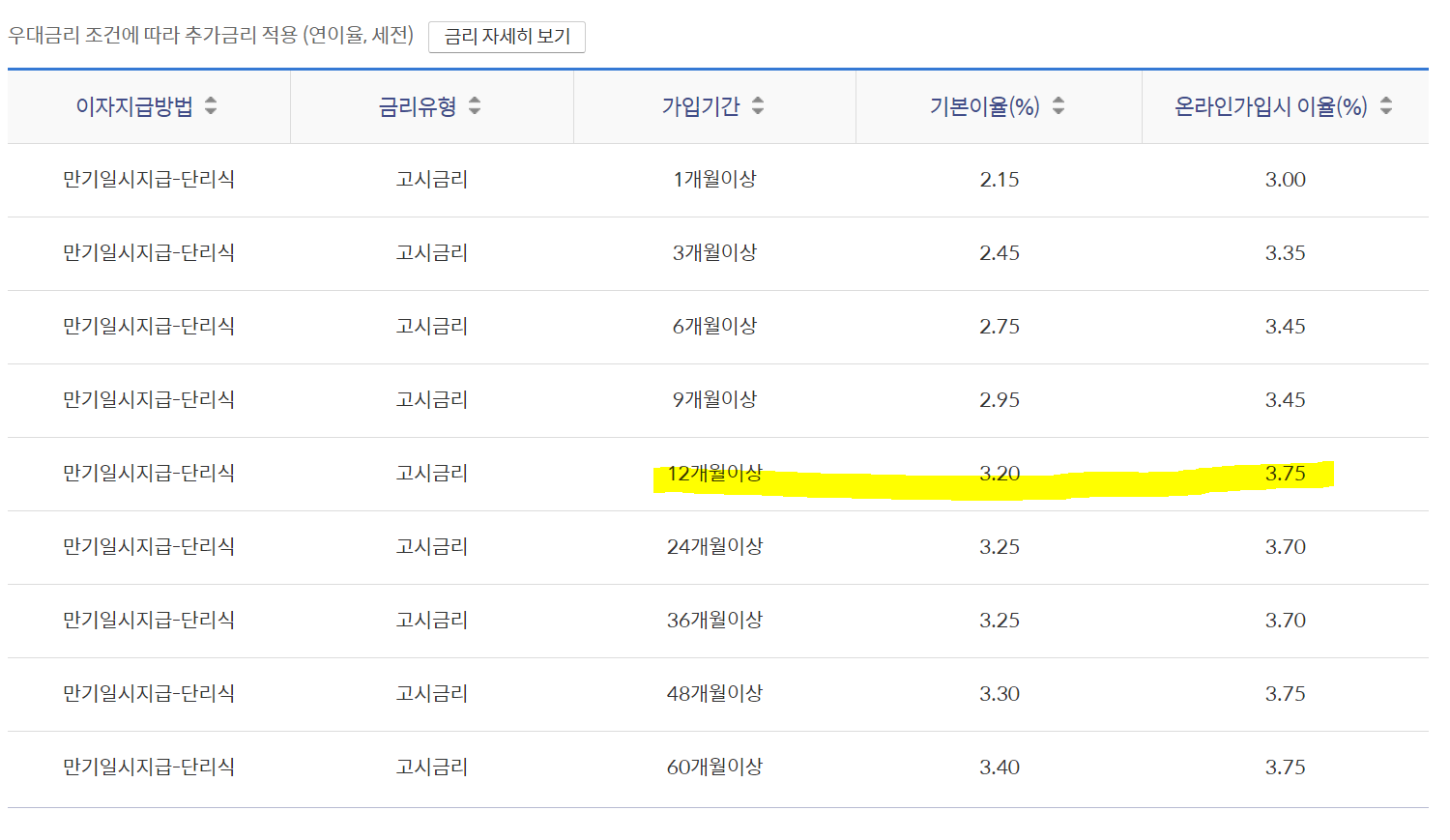 03. 신한은행신한은행의 예금 상품 중 "쏠편한 정기예금"의 경우 12개월 이상, 24개월 미만에서 최대금리 연3.75%(세전)를 적용해준다. 11월에 조사했을 때보다 금리가 내려간 것을 확인하할 수 있다. 약 1.2% 금리가 내려갔다.