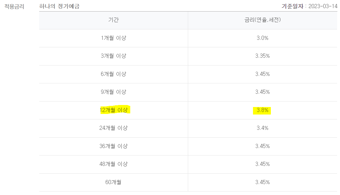01. 하나은행하나은행에서 취급중인 "하나의 정기예금" 12개월 이상, 24개월 미만에서 최대 금리 연3.8%(세전)를 적용해준다. 11월에 조사했을 때보다 금리가 내려간 것을 확인하할 수 있다. 약 1.2% 금리가 내려갔다.