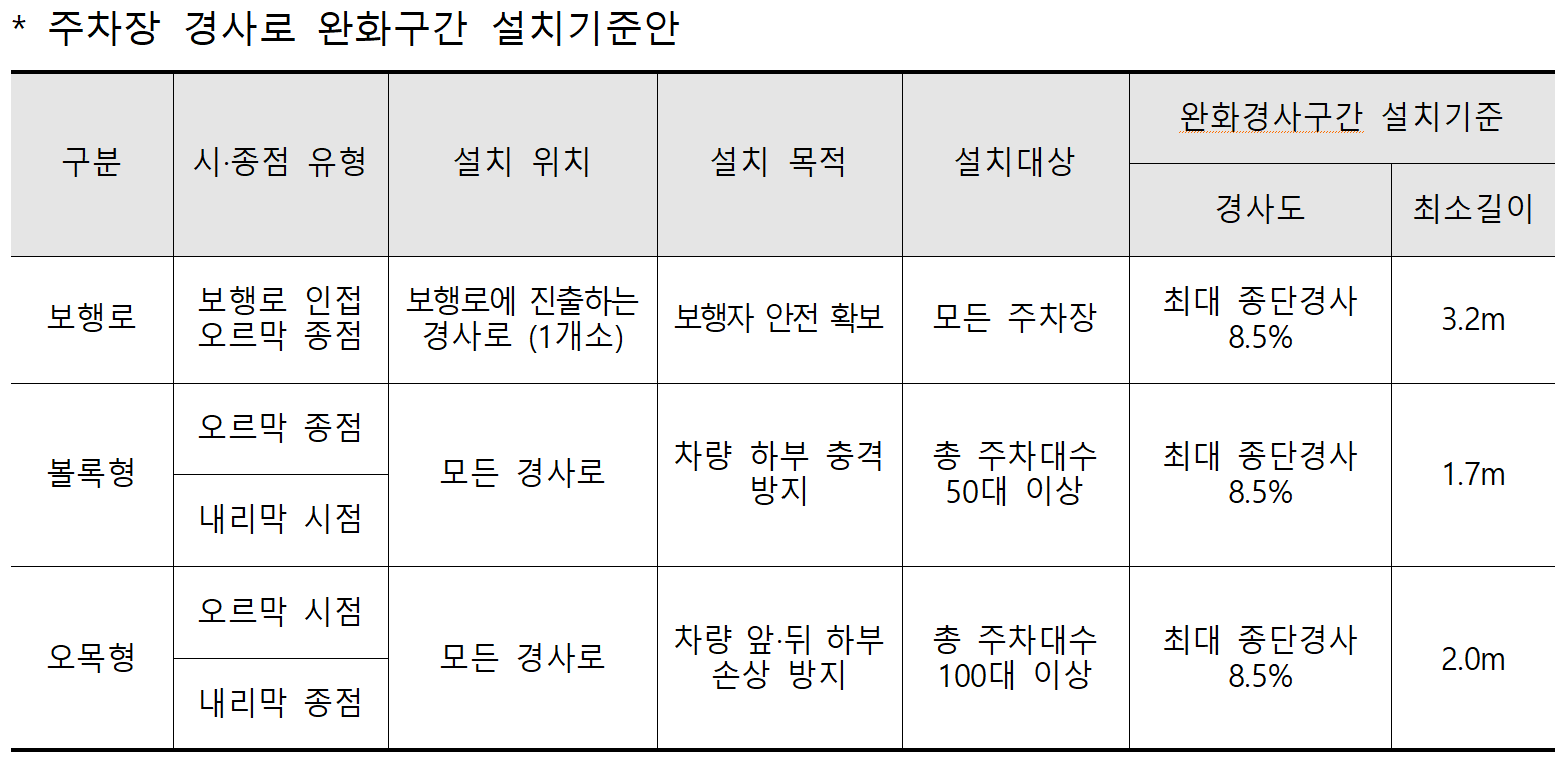 ㅇ 이에, 전기차를 포함한 차량과 보행자 안전을 위해 주차장 경사로 시‧종점 구간에 완화구간을 도입할 계획이다.