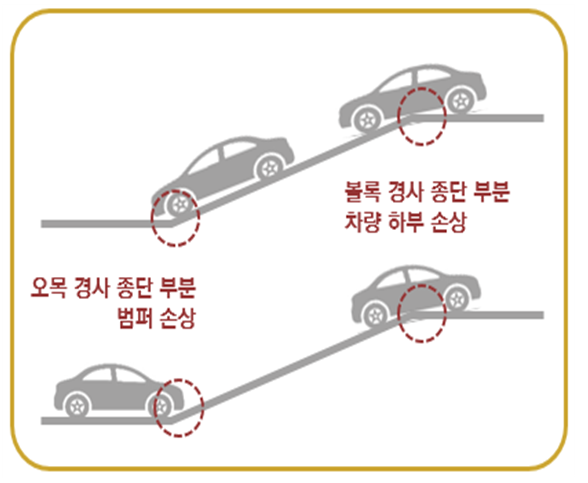 02. 주차장 경사로 완화구간 도입ㅇ 배터리가 차량 하부에 설치된 전기차는 지하주차장 경사로를 통하여 출차할 때 차량 하부가 경사로 종점 구간에 부딪힐 우려가 있었고, 주차장 경사로 시‧종점 구간에서 차량 하부가 경사로에 부딪힐 가능성이 있었다.