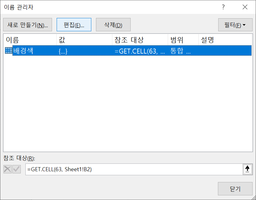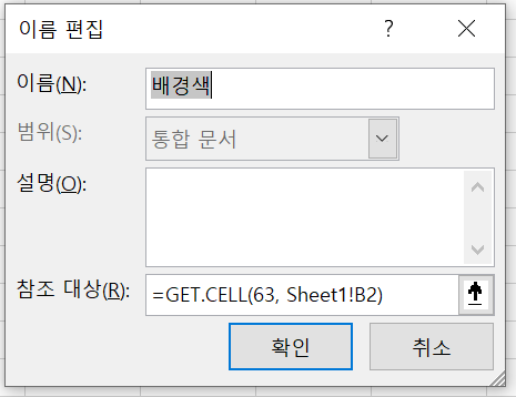참조 대상에 GET.CELL(63, Sheet1!B2)를 입력해준다. GET.CELL의 첫 인자인 63은 배경색을 의미한다.