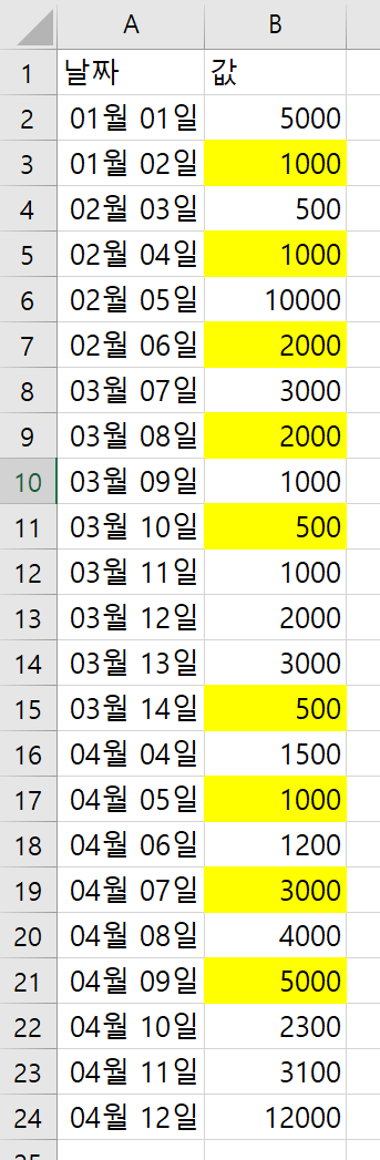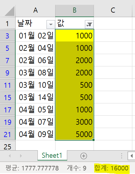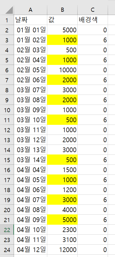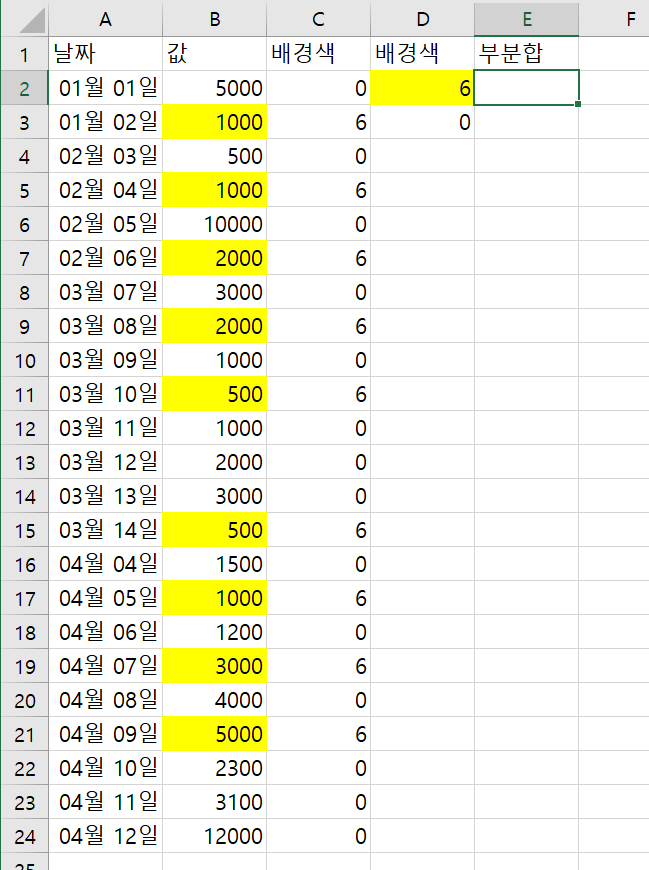 위 그림과 같은 데이터가 있을 때, B열에 있는 값 중에서 배경색이 노란색인 셀의 값만 더하는 작업을 해야 한다면 어떤방식으로 해결해야 할까?