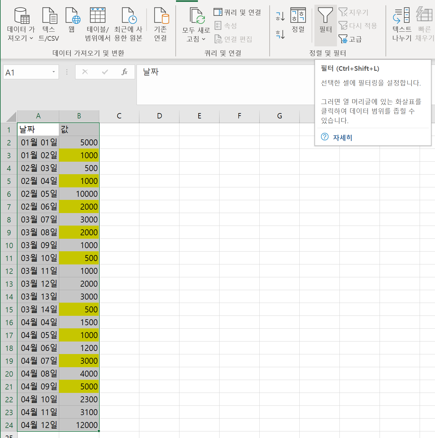 제목열을 포함한 데이터 영역 선택 후에 데이터>정렬 및 필터에서 필터 아이콘을 누른다.