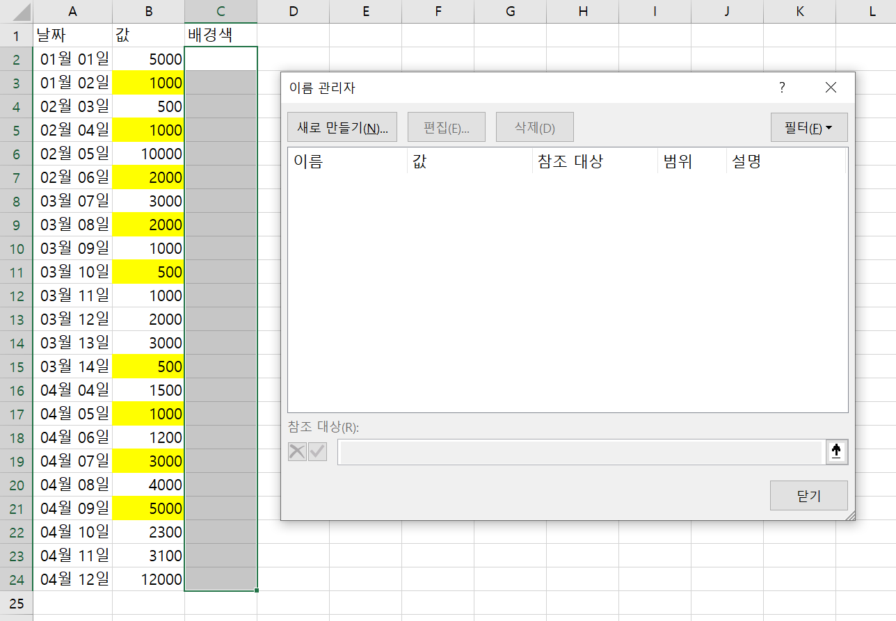 - C열에 이름 사용하기 (이름 관리자에서 이름을 배경색으로 지정했기 때문에 =배경색을 이용하여 GET.CELL(63, Sheet!B2)의 결과를 얻을 수 있다)
