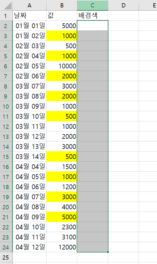 - C열에 배경색을 추출해보자. C열의 배경색이 들어갈 영역을 선택한다.