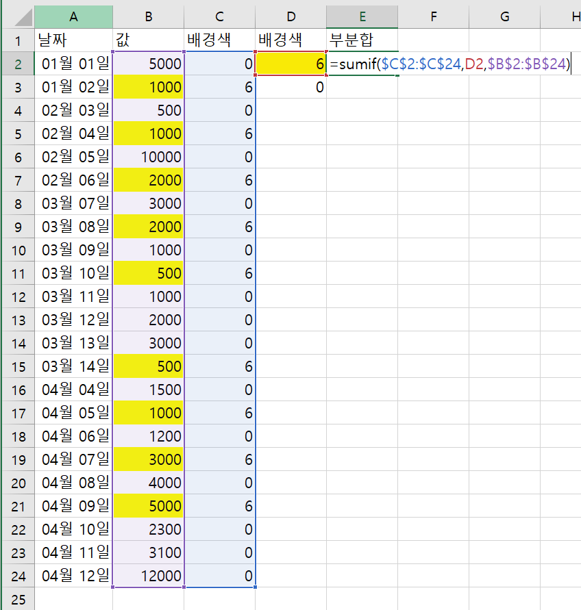 배경색을 구분할 수 있기 때문에 SUMIF를 사용하여 결과를 쉽게 도출할 수 있다.