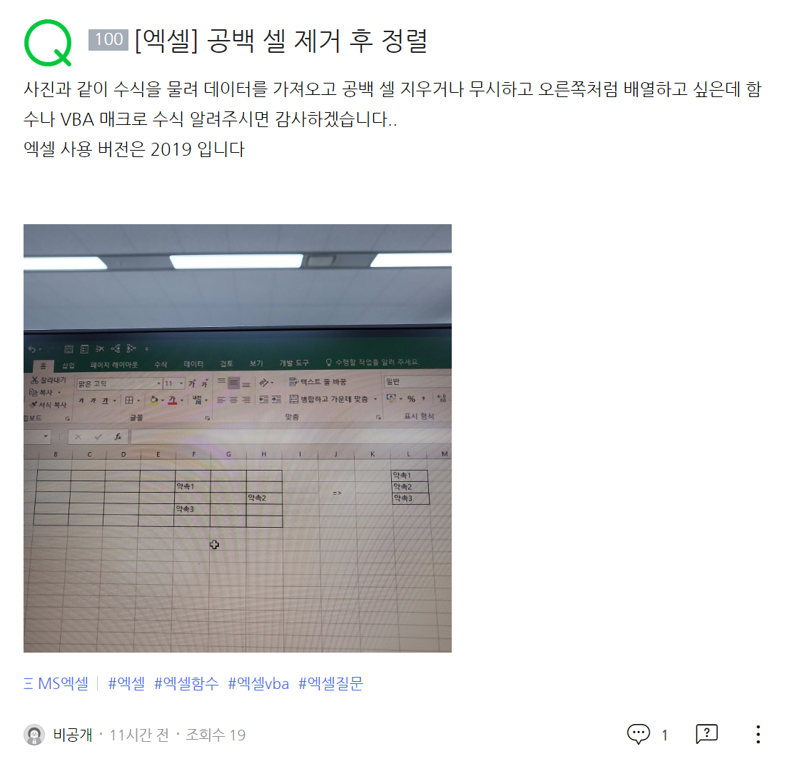 Excel [지식인 해결 시리즈] 002. 공백 셀 제거 후 정렬Excel/Excel 지식인 2022. 8. 23. 01:15728x90