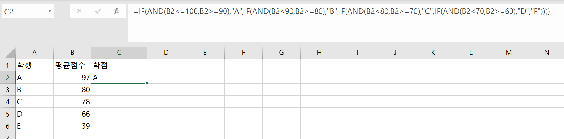 학점이 C일 조건: B2 <80 AND B2 >=70 따라서 수식은 AND(B2 < 80, B2 >= 70)