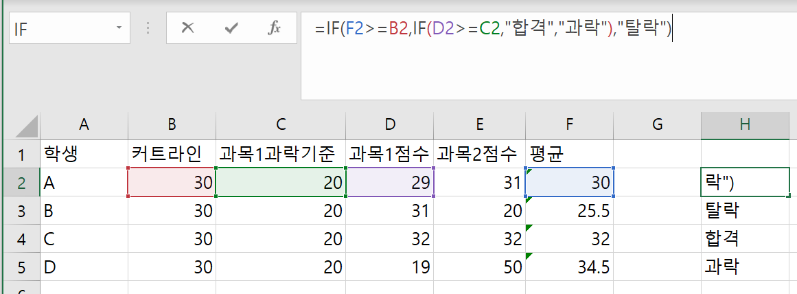 =IF(F2>=B2, IF(D2>=C2,"합격","과락"), "탈락")