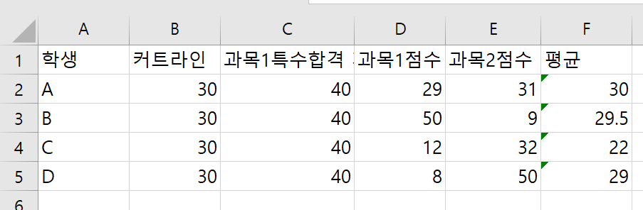 - 평균 점수가 커트라인 이상이고, 과목1점수가 과목1 과락 기준 미만일 경우 과락