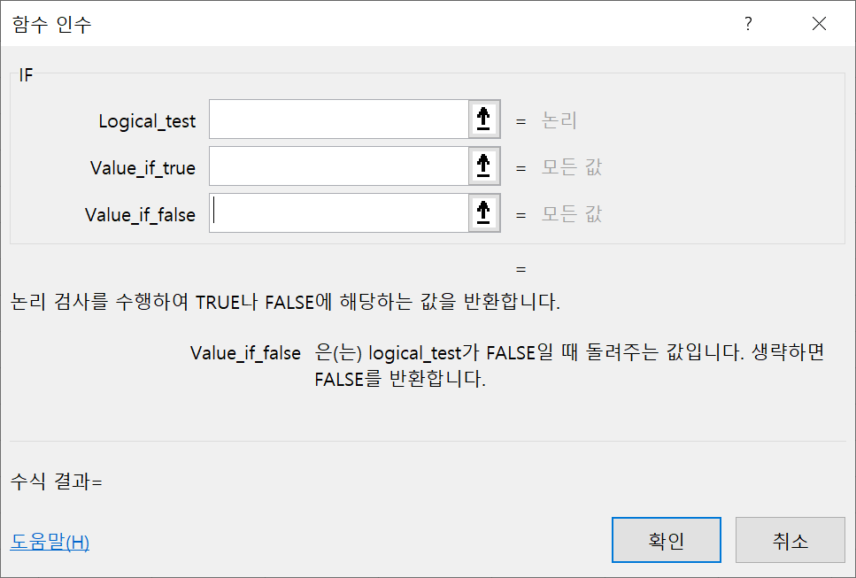 - Value_if_true: Logical_test가 TRUE 일 때 돌려주는 값(생략 시에는 TRUE를 반환)