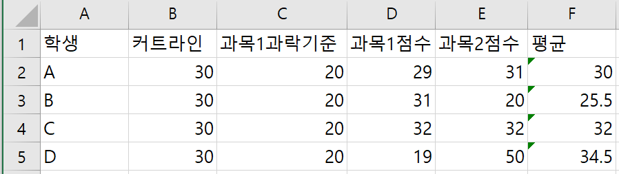 - 평균점수가 60점 미만 이면 "F"위와 같은 데이터가 있을 때 학점을 계산해보자.