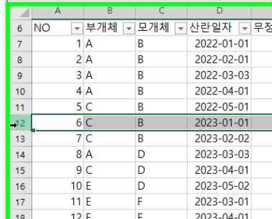 또한 좌측의 행번호를 보면 기존의 행번호가 유지되는 상태에서 필터를 거치지 못한 데이터들이 숨김 처리된 것을 확인할 수 있다.