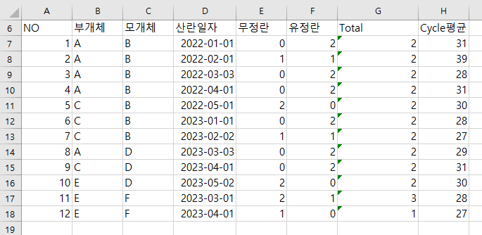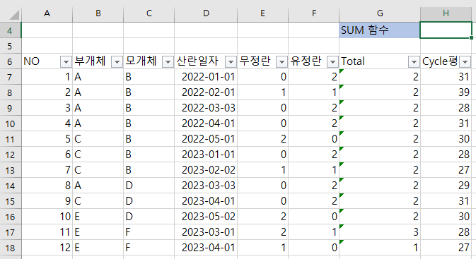 셀H4에 다음과 같은 수식을 입력하면 무정란 유정란을 포함하여 생상된 모든 달걀의 수가 구해진다.