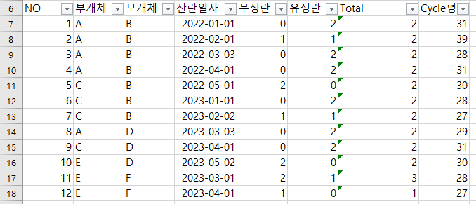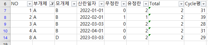 필터에서 특정한 데이터를 선택 필터 결과 부개체의 값이 A인 데이터만 화면에 보여지는 것을 확인할 수 있다.