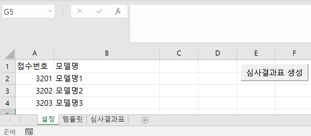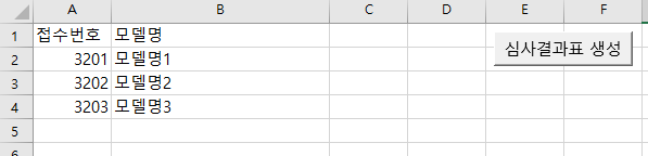 - 설정: 접수번호와 모델명이 들어갈 시트로 심사결과표 생성을 위한 버튼을 포함하고 있다.