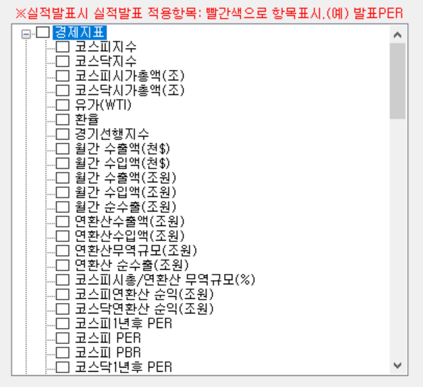 경제지표를 클릭하면 퀀트킹에서 제공하는 모든 경제지표를 확인할 수 있고, 경제지표 앞에 있는 체크박스를 체크하면 로직으로 추가된다. 위 지표들은 시장 공통으로 공유하는 지표이며, 개별 종목마다 달라지는 지표가 아니라는 것을 기억하자.