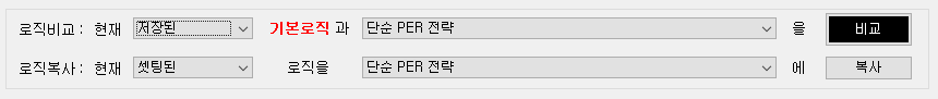 현재 화면에 셋팅된 값과 오른쪽에서 선택한 로직과 비교를 수행(여기서는 단순 PER 전략이라는 이름의 로직과 비교를 수행함)