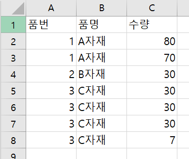 1234567891011121314151617181920212223242526272829303132333435363738394041Sub DivideAndPaste()'Sheet1의 데이터의 행 수 확인Dim dataRowNum As LongdataRowNum = Worksheets("Sheet1").Cells(Rows.Count, 4).End(xlUp).Row'Sheet2에 쓰기가 수행될 행을 지시하는 변수 선언 및 2로 초기화 (1열은 제목)Dim writeRowPosition As LongwriteRowPosition = 2'Sheet1의 데이터 순회하면 Sheet2 작성For rowItem = 2 To dataRowNum'수량 추출itemCountA = Worksheets("Sheet1").Cells(rowItem, 3).Value'적입수 추출divider = Worksheets("Sheet1").Cells(rowItem, 4).Value'적입수, 수량이 숫자인 경우, 적입수가 0이 아닌경우만 데이터 분할 수행If IsNumeric(itemCountA) And IsNumeric(divider) And divider <> 0 Then'분할할 열의 수 구하기Sol = Int(itemCountA / divider) + 1'나머지값 구하기Remainder = itemCountA Mod divider'분할할 열의 수만큼 반복하며 값 채우기For rowItemN = 1 To Sol'품번과 품명은 그대로 복사Worksheets("Sheet2").Cells(writeRowPosition, 1) = Worksheets("Sheet1").Cells(rowItem, 1)Worksheets("Sheet2").Cells(writeRowPosition, 2) = Worksheets("Sheet1").Cells(rowItem, 2)'맨 마지막 행일 경우 나머지 값으로 수량 입력If rowItemN = Sol ThenWorksheets("Sheet2").Cells(writeRowPosition, 3) = Remainder'맨 마지막 행이 아닐 경우 적입수로 수량 입력ElseWorksheets("Sheet2").Cells(writeRowPosition, 3) = dividerEnd If'Sheet2에 쓰기가 수행될 행을 지시하는 변수 1증가writeRowPosition = writeRowPosition + 1Next rowItemNEnd IfNext rowItemEnd Subcs 위의 Sub 프로시저를 실행한 결과는 다음과 같다.