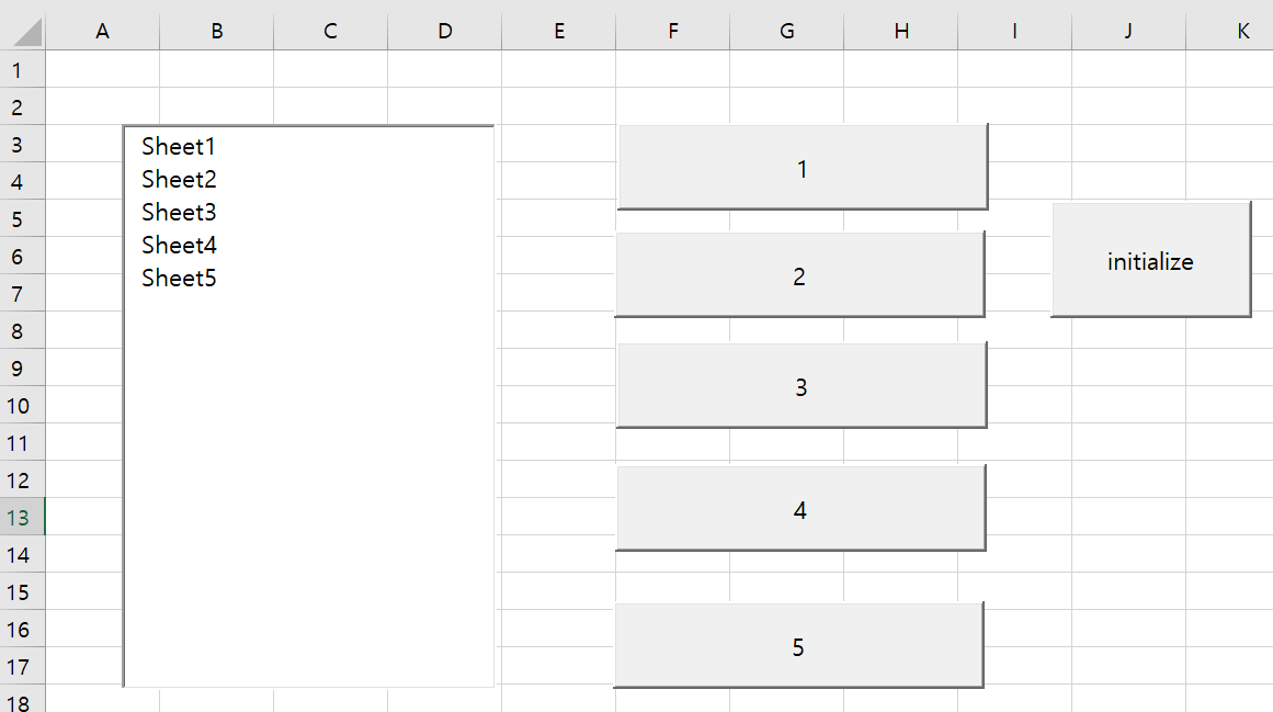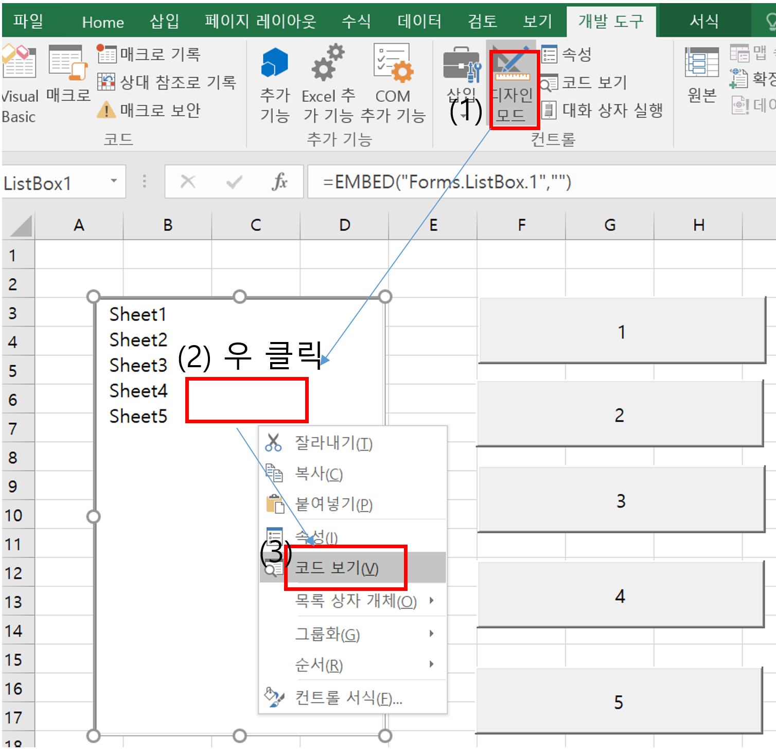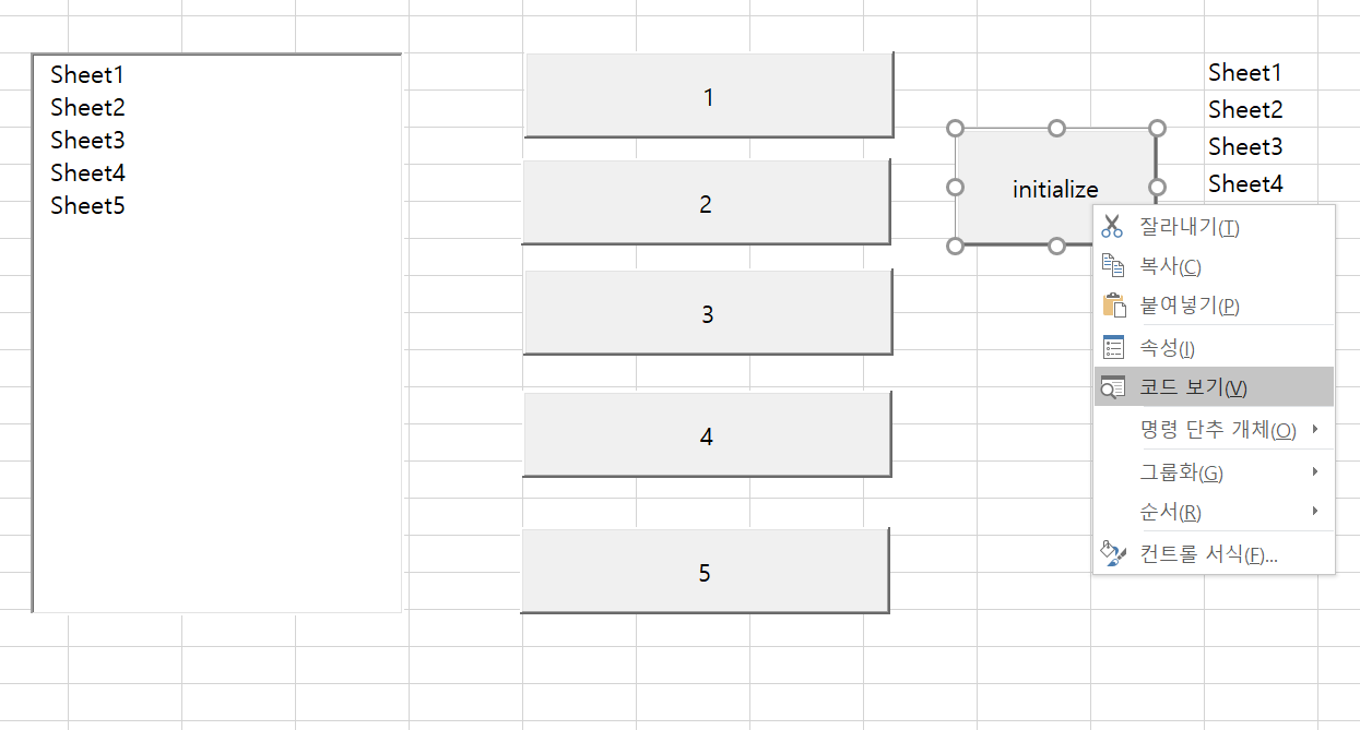 12345678910111213141516171819202122232425Sub Init()Set btn1 = ActiveSheet.OLEObjects("ToggleButton1").ObjectSet btn2 = ActiveSheet.OLEObjects("ToggleButton2").ObjectSet btn3 = ActiveSheet.OLEObjects("ToggleButton3").ObjectSet btn4 = ActiveSheet.OLEObjects("ToggleButton4").ObjectSet btn5 = ActiveSheet.OLEObjects("ToggleButton5").ObjectSet ListBox1 = ActiveSheet.OLEObjects("listBox1").Objectbtn1.Caption = "1"btn2.Caption = "2"btn3.Caption = "3"btn4.Caption = "4"btn5.Caption = "5"ListBox1.ClearListBox1.ListIndex = -1ListBox1.AddItem "Sheet1"ListBox1.AddItem "Sheet2"ListBox1.AddItem "Sheet3"ListBox1.AddItem "Sheet4"ListBox1.AddItem "Sheet5"End Subcs 위 코드를 설명하기 전에 일단 각각의 컨트롤(목록상자, 토글 버튼, 명령버튼)에 접근할 수 있는 이름을 알아야한다.