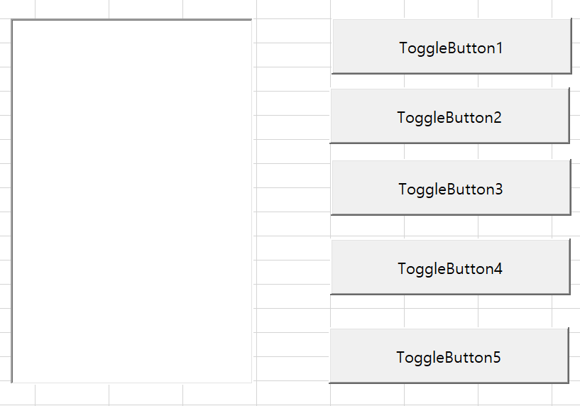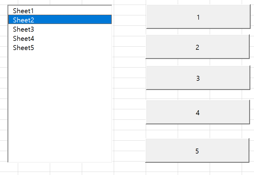 목록상자에 Sheet1~Sheet5의 값을 넣어주고, 토글 버튼의 이름을 1~5로 변경해준다. 여러가지 방법이 있지만 본 포스트에서는 다음과 같은 매크로를 작성했다.
