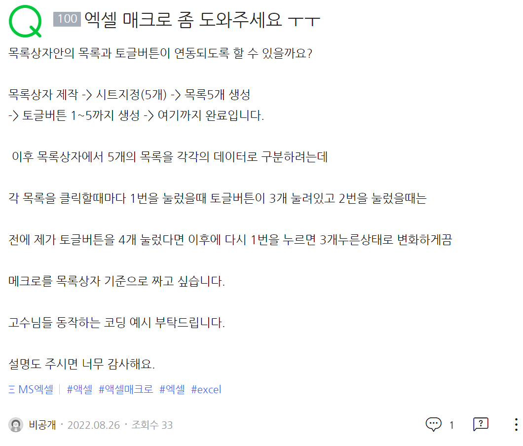 Excel [지식인 해결 시리즈] 004. 목록상자, 토글버튼 연동Excel/Excel 지식인 2022. 8. 27. 21:44728x90