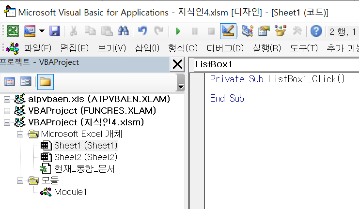 위 그림처럼 Sheet1 객체에 LisbBox1_Click() Sub 프로시저가 만들어지는 것을 확인할 수 있다.