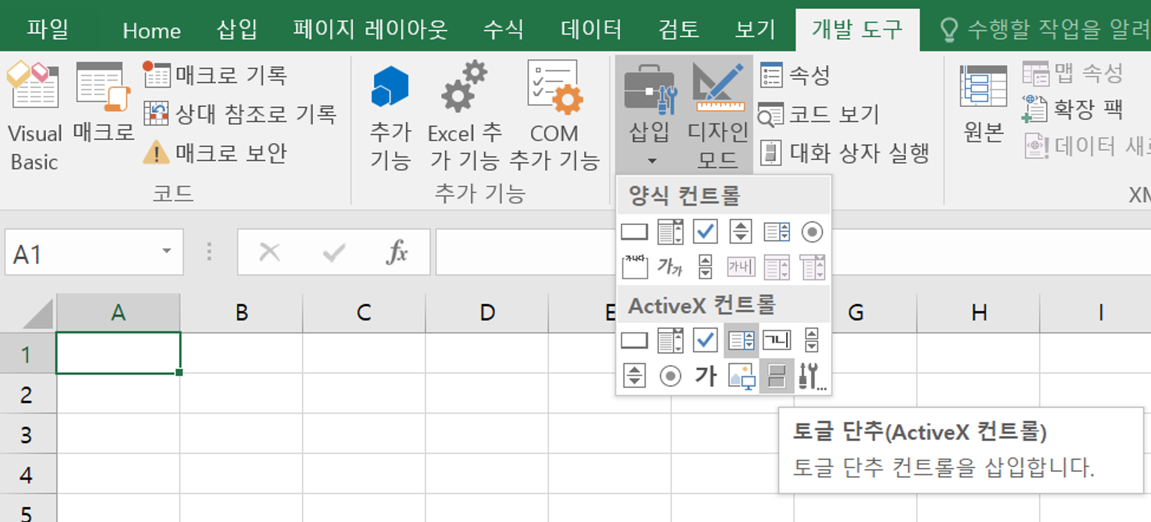 개발도구 > 삽입 > ActiveX 컨트롤 > 토글단추