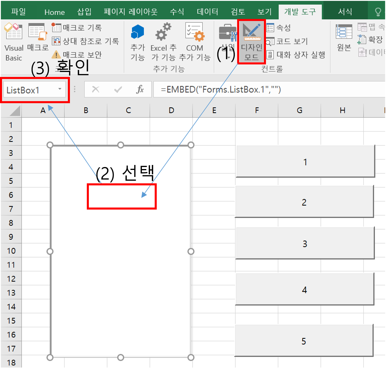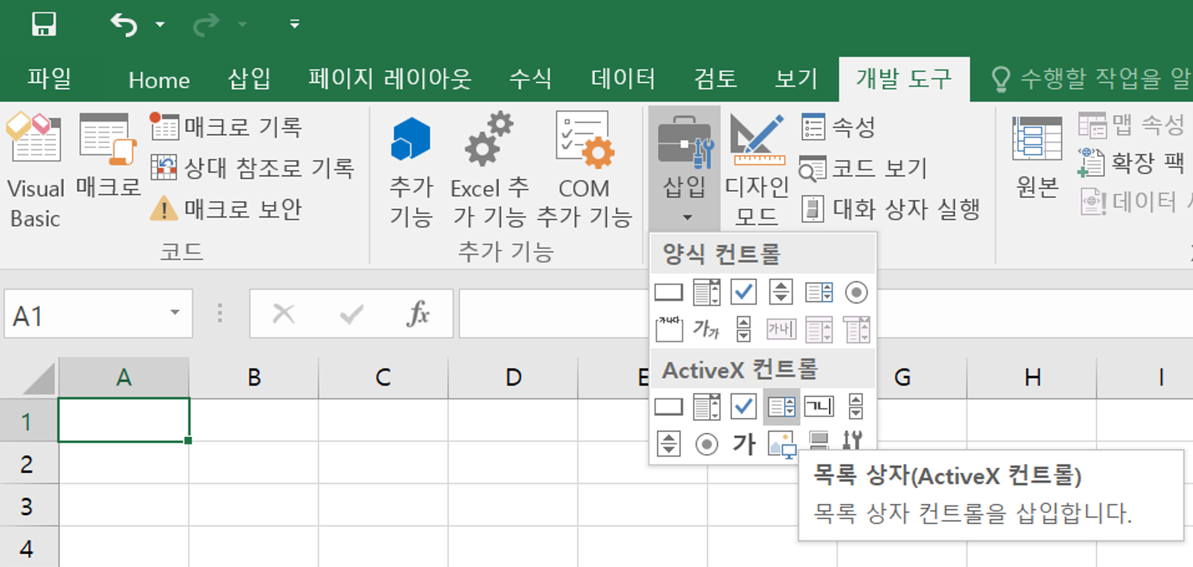 개발도구 > 삽입 > ActiveX 컨트롤 > 목록상자를 선택한다. (드래그로 삽입가능)