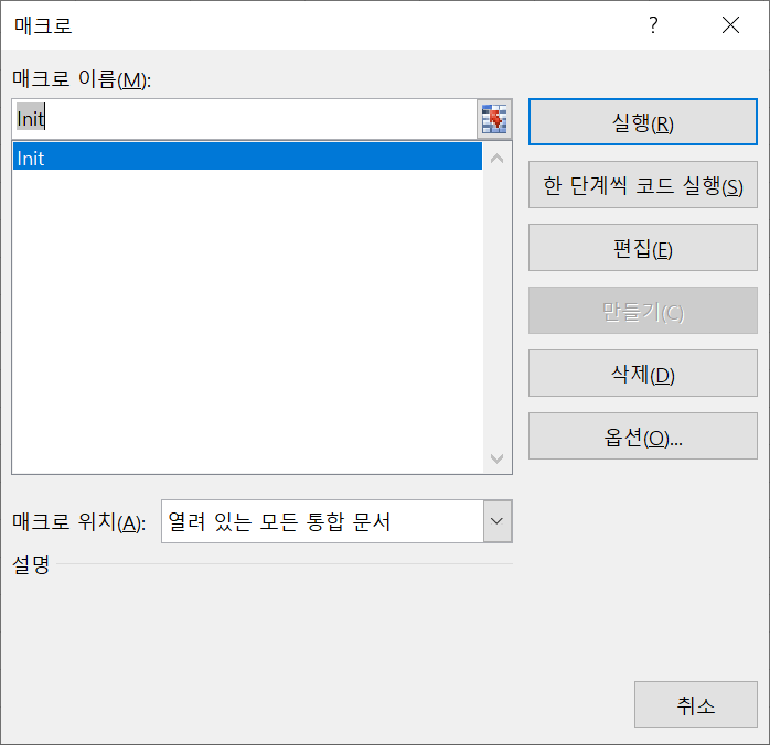 위의 Sub 프로시저 Init은는 모듈에 정의되어 있고, 컨트롤들은 WorkSheet에 포함되어 있기 때문에 Sub 프로시저에서 바로 컨트롤에 접근하는 것은 불가능하다.